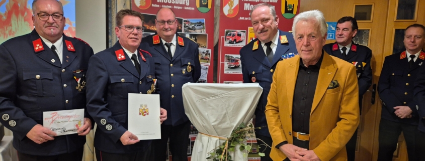 Für seine 14-jährige Tätigkeit als Gemeindefeuerwehrkommandant wurde BM Thomas Duss seitens des Kärntner Landesfeuerwehrverbandes, vertreten durch BFK OBR Mag. Ulrich Nemec, das Ehrenzeichen am Band in Silber überreicht.
