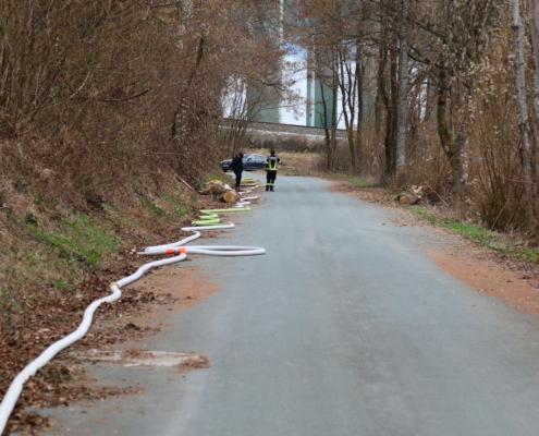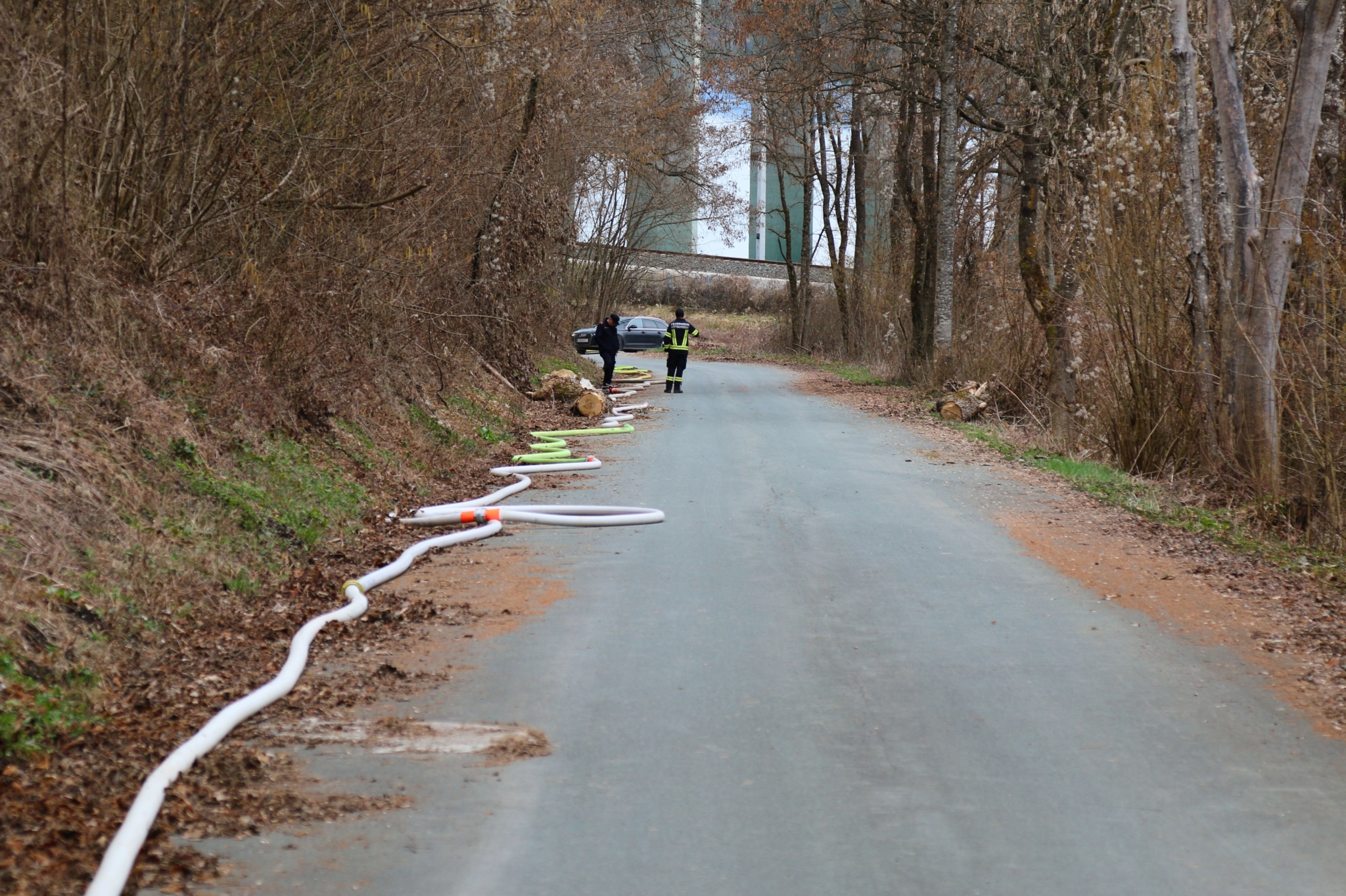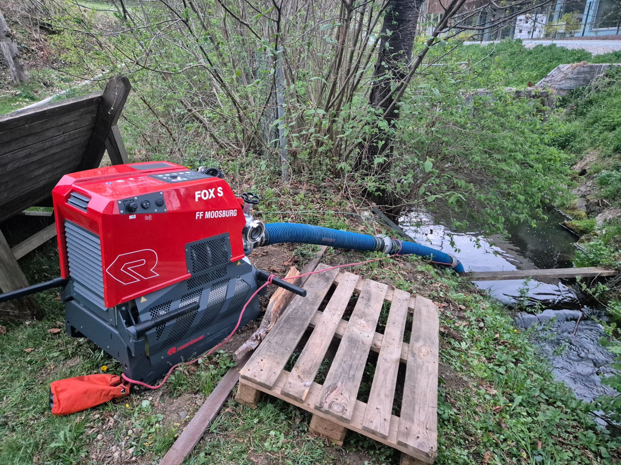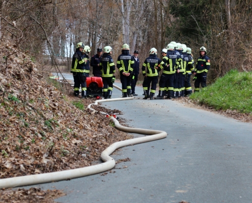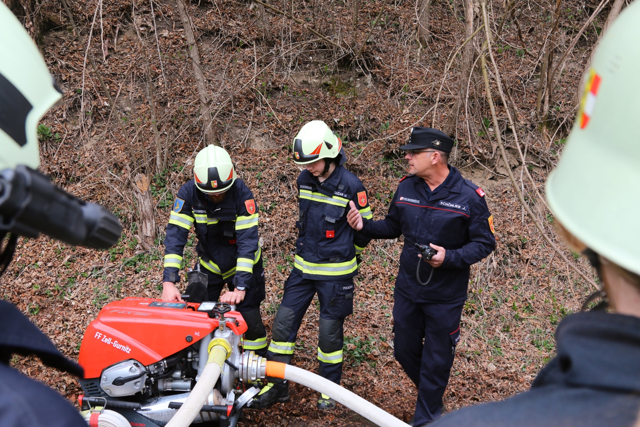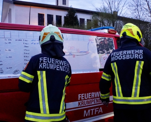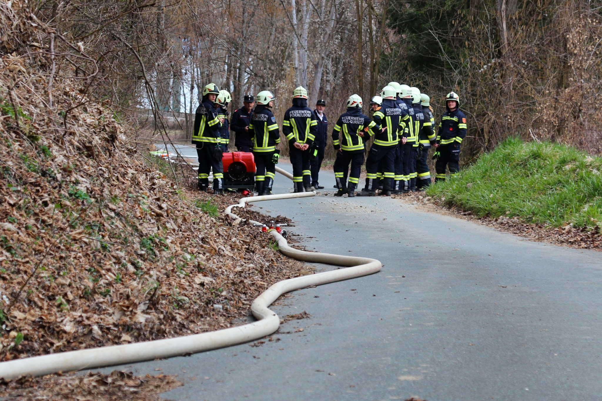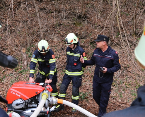 Inzwischen wurde vom LFA Moosburg und LF Kreggab eine Zubringleitung aus dem nahegelegenen Bach zum Übungsobjekt gelegt. Die FF Krumpendorf baute die Angriffsleitung auf und stellte den ersten Atemschutztrupp. Die Feuerwehren Tigring und Bärndorf-Stallhofen bauten jeweils eine Zubringleitung von einem Hydranten auf. Die FF Seigbichl richtete gemeinsam mit der FF Krumpendorf den Atemschutzsammelplatz und den Sanitätsplatz ein.