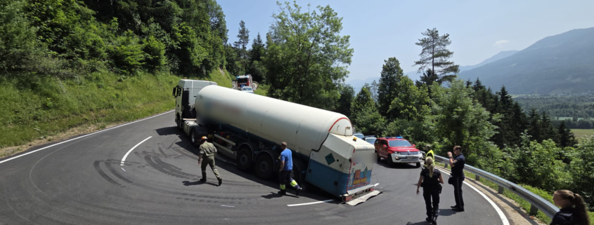 Auch dieses Mal blockierte der LKW, der rund 16 Tonnen Flüssigstickstoff geladen hatte, die Fahrbahn. Daher wurden weitere Kräfte und Fahrzeuge von der Berufsfeuerwehr Klagenfurt und der Feuerwehr Ferlach zur Unterstützung alarmiert. Unter den Reifen des Sattelzugs wurde eine Rampe mit Holzbalken und Bretter verbaut um eine stabile Bergung aus der Kurve zu gewährleisten.