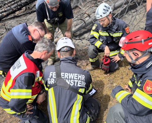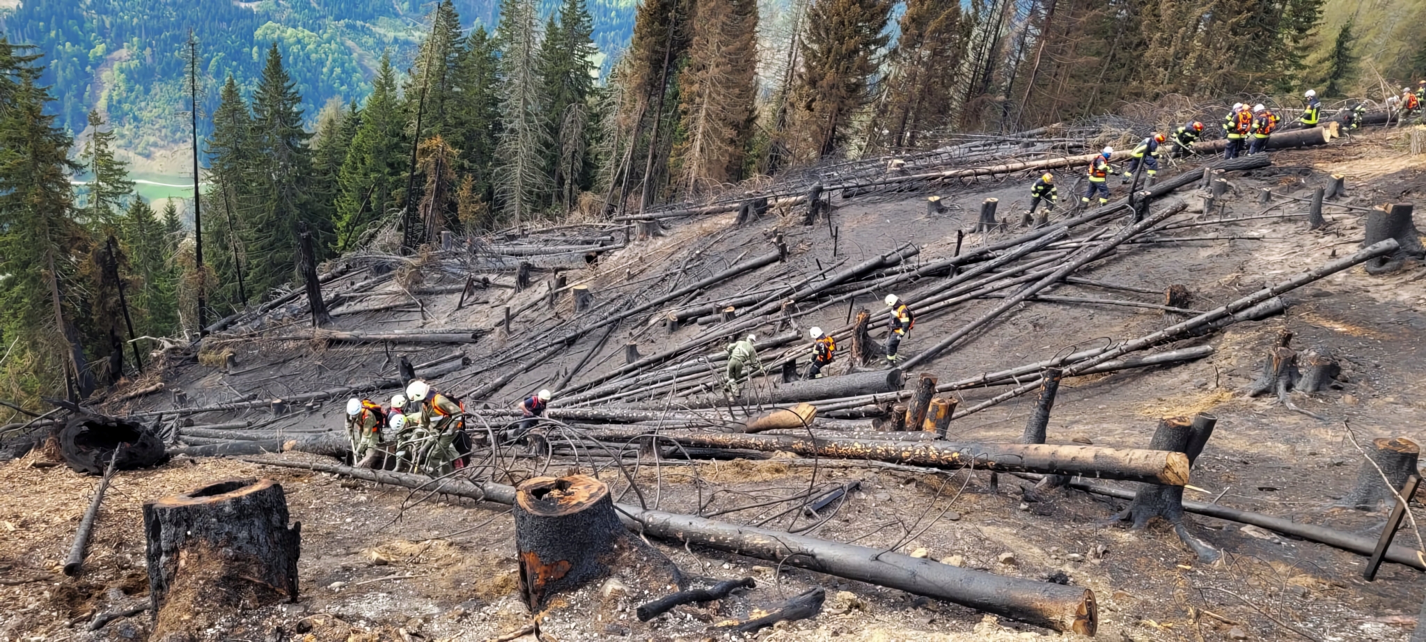 Das Einsatzgebiet stellte die Kräfte vor besondere Herausforderungen: Das Gelände ist äußerst steil und nur schwer zugänglich, weshalb mehrere MRAS-Trupps eingesetzt wurden, um ein sicheres Arbeiten in exponierten Lagen zu gewährleisten. Parallel dazu waren umfangreiche Holzarbeiten erforderlich, um Glutnester freizulegen und eine weitere Ausbreitung des Brandes zu verhindern. Ein Großteil der Tätigkeiten musste in mühevoller Handarbeit durchgeführt werden. Mit Hauen und Löschrucksäcken arbeiteten sich die Einsatzkräfte Schritt für Schritt durch das Gelände, um verbliebene Glutnester gezielt abzulöschen.