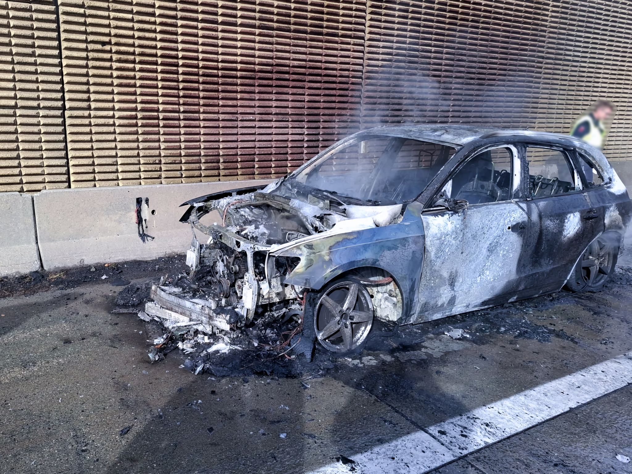 Bereits beim Eintreffen der Einsatzkräfte stand das Fahrzeug in Vollbrand. Auch auslaufende Betriebsflüssigkeiten hatten Feuer gefangen, und durch die enorme Hitze bestand die Gefahr, dass die Flammen auf die Lärmschutzwand übergreifen.
