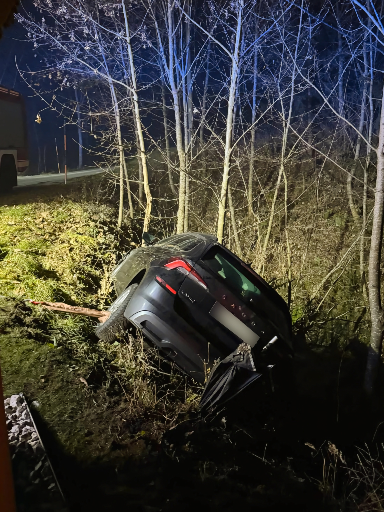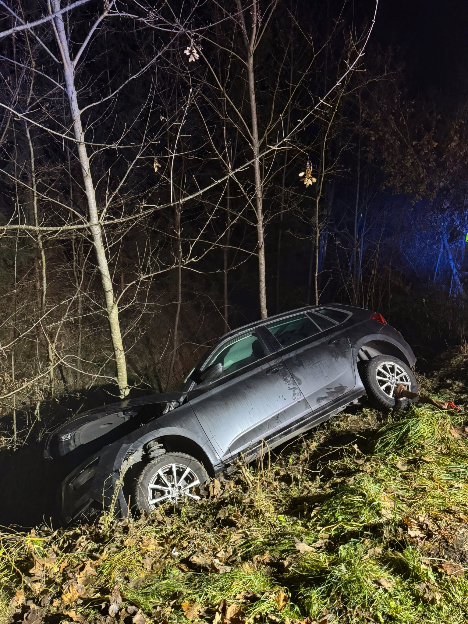 Beim Eintreffen der Feuerwehren stellte sich heraus, dass das Fahrzeug von der Straße abgekommen und gegen zwei Bäume geprallt war. Es befanden sich keine verletzten Personen im Auto. Mittels Greifzug wurde das Fahrzeug gesichert und